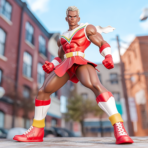 a full body shot of a McFarlane Toys style action figure of a male androgynous African American superhero, dyed blond short hair, white and red cheerleader outfit, Doc Martens boots, muscular, super strength powers, strong legs, articulated arms and legs, photorealistic professional photography --niji 5