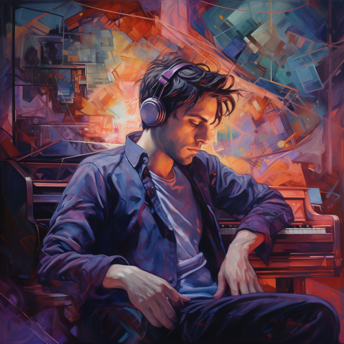 deep, mostly jewel toned, purple and blue, decomposing and emotionless headphones wearing man playing a piano in the foreground, lost in thought, chaotic apocalypse of vibrant musical and mortality inducing imagery visible in the background in warm contrasting colors