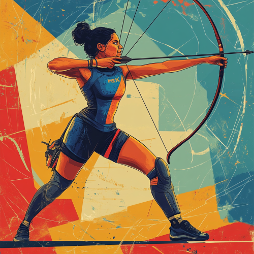 create an illustrated image of a paralympic archer where she is using her feet and shoulder to aim the bullseye and the background should be dynamic and full of energy and giving paralympic vibes