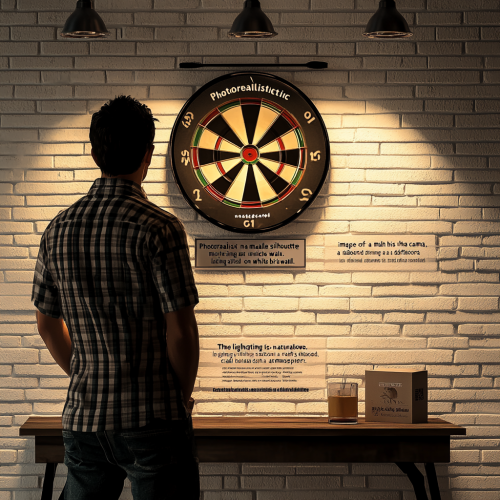 "Photorealistic image of a male silhouette playing darts indoors. The man stands with his back to the camera, aiming at a dartboard mounted on a white brick wall. The lighting is natural, with soft shadows creating a relaxed atmosphere. A table beneath the dartboard holds a small box and a drink, emphasizing a casual game setting. The dartboard features traditional markings, and the room's minimalistic design adds focus to the game." --style raw --stylize 200 --v 6.1