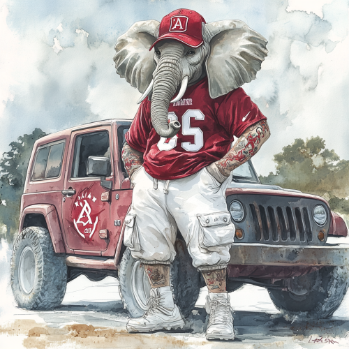 Create a 3D hyper realistic airbrush alcohol ink watercolor illustration of a caricature of an Alabama crimson tide elephant with white embellishments. He is wearing a Alabama crimson tide football jersey and cap, white cargo pants, and red, white Air Force ones, as he leans against a jeep with a tattoo like Alabama logo symbol on the side and the hood. Soft scenery background.
