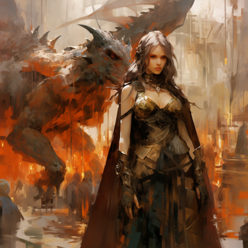 abstract brushbrokes by jeremy mann of female topaz (orange scaled ) dragonborn (anthropomorphic dragon person), fantasy market --v 5.2