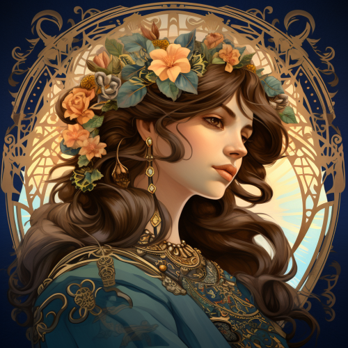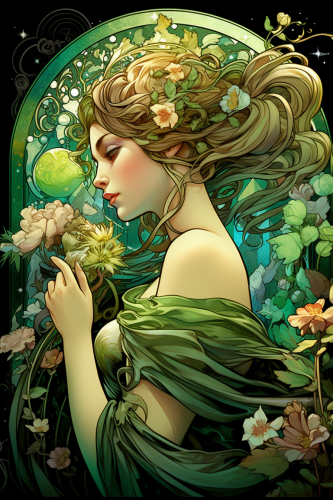 Digital illustration like Alphonse Mucha, with elegant witch.
