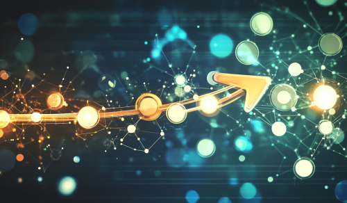A futuristic, minimalistic image representing the impact of backlinks on SEO. In the center, a glowing, upward-pointing arrow symbolizes growth and rising rankings. Surrounding the arrow are several connected nodes, where larger, vibrant circles represent high-quality backlinks, and smaller, dimmer circles represent low-quality links. The high-quality links are shown feeding directly into the arrow, while the low-quality links are scattered and fading. The background features a digital marketing grid with soft gradients of blue, white, and green, giving a modern, tech feel. suggest some analytics in background --ar 182:107