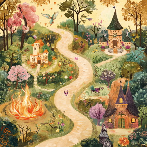 Design a whimsical 2D illustration of a fairytale map that represents a magical journey through the fragrances of Avon. The map should be viewed from above and feature vibrant colors and enchanting landscapes. Pathway: Illustrate a winding path that guides the viewer through various fragrance locations, each represented by unique visual elements related to the scent's character. Firebird Location: Create a specific location on the map inspired by the firebird, featuring lush foliage, sparkling elements, and mythical creatures that embody beauty and allure. This area should radiate warmth and magic, inviting users to explore further. Fragrance Icons: Include symbols or icons that represent each fragrance along the path, such as flowers, fruits, or other thematic elements that evoke the essence of the scents. The overall design should evoke a sense of wonder and adventure, encouraging viewers to embark on their own magical journey through the world of Avon fragrance