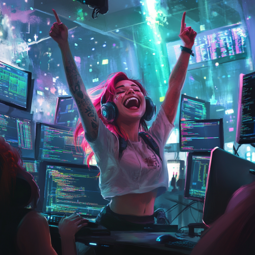 an IT team in a room full of Monitors partying hard after a successfull release, The female project lead in the center with a broad smile, high quality