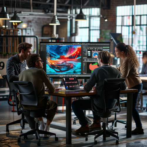 Marketing team strategizing over a digital campaign for a new movie release, using data analytics on a large monitor, shot in a Back Angle with the Sigma 18-35mm F1.8 Art DC HSM Lens to capture the collaborative spirit and digital focus; superb quality, photorealistic. --v 6.0