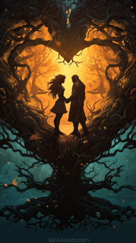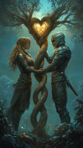 Two, geminis, warriors, lovers, medieval fantasy, Heart shape, union, heavy armors, digital painting, tree of life with snake around the trunk, tarot, Franz Frazetta Style, fantasy, --ar 9:16