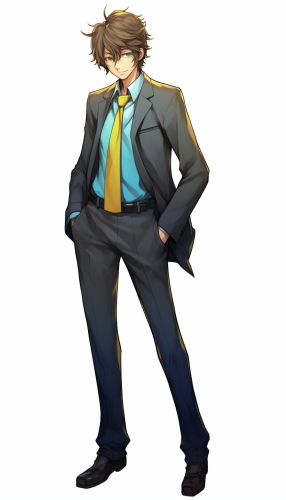 a man in a green suit, he is wearing a big purple tie, he has purple gloves, purple shoes, he stands on a cane, full body, in cartoon style --ar 3:4 --v 6.0