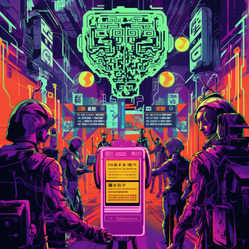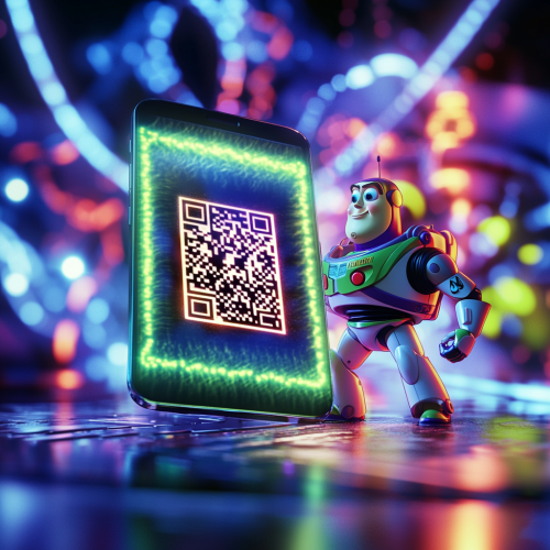 Realistic image of a phone scanning a QR code, with a human-like 3D character similar to Toy Story style emerging from the screen. The background is abstract, with a wide-angle view showing a bit of the phone and the character. Soft lighting from the phone's screen illuminates the scene, with the QR code subtly visible.