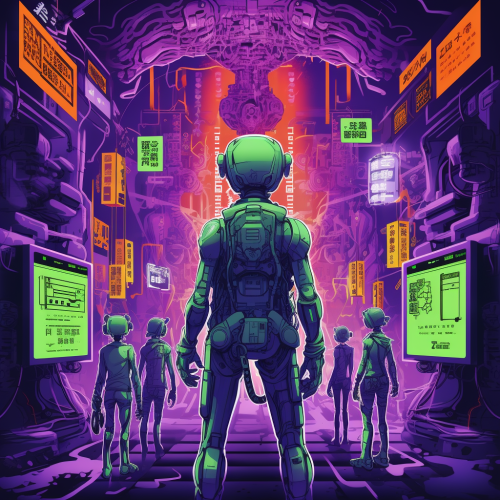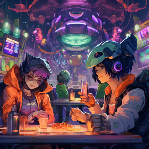 style of cowboy bebop, humanoid aliens with virtual reality headsets playing at a futuristic bar, qr code on tv screen, neon green, orange and purple,