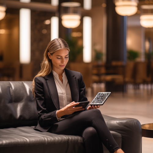 A highly realistic image of a hotel guest sitting comfortably in a luxurious and modern hotel lobby. The guest is casually dressed, looking intently at their smartphone. In the foreground, there is a sleek, small table with a clear, prominently displayed QR code on a stand. The lobby should have a contemporary design, with elegant furniture, ambient lighting, and an inviting, high-end atmosphere. The image should emphasize the blend of luxury, technology, and guest convenience in a hotel setting