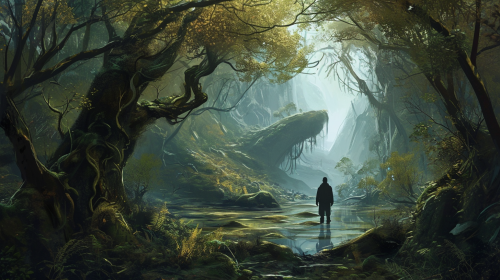 A dark lake::1 A dense forest::1 A tear in the sky::1 A dilapidated and ruined world, oil paint --ar 16:9 --v 6.0