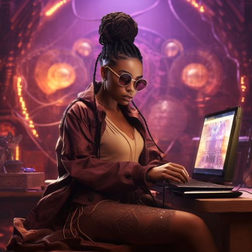 a cocoa skinned african american woman in her 20s with braids and glasses sitting in front of a laptop doing digital work, providing services, purple and yellow in the color scheme, in the style of daz3d, afrofuturism, backlit photography, crimson, jazzy, fashionable flair, high tonal range, authentic expressions, correct fingers :: 10