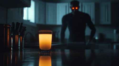 A dark kitchen with a single glowing glass of milk on a counter. In the background, a faint, shadowy outline of Homelander, with his red eyes glowing softly, watching the milk. The scene is minimalistic, focusing on the contrast between the glowing milk and the darkness --ar 16:9