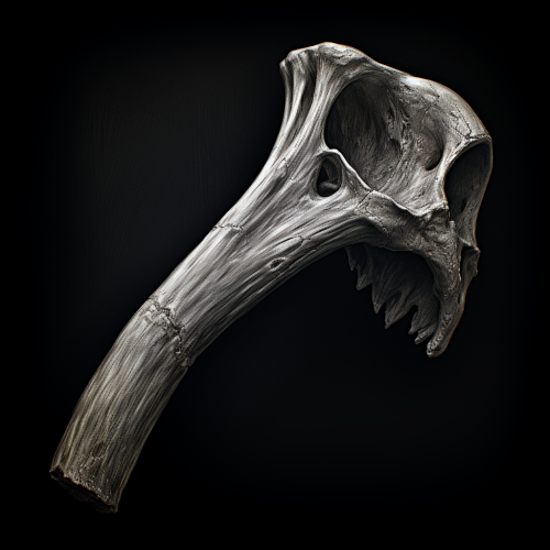 a garage that is covered in dinosaur bones. There is a circular tunnel in the front of the garage. The outside of the tunnel has a circle of dinosaur bones. Hanging outside on the garage is a dodo bird Skeleton. Behind the garage there is a concrete building that has been destroyed by a bomb.