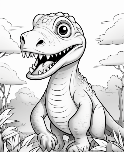 coloring page for kids, spinosaurus dinosaur, single object, minimalist, thick line, low detail, no shading --v 6.1 --style raw --stylize 175 --ar 5:4