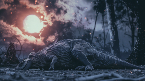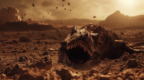 still from science film, a dead dinosaur on the ground, after the asteroid impact, dark and sandy sky, --ar 16:9