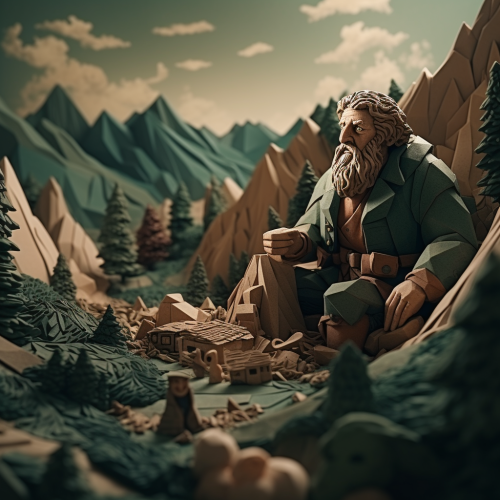 Stop motion animation of a ancient roman philosopher going on an adventure across a mountainous landscape, made of clay, dark green and ivory color palette