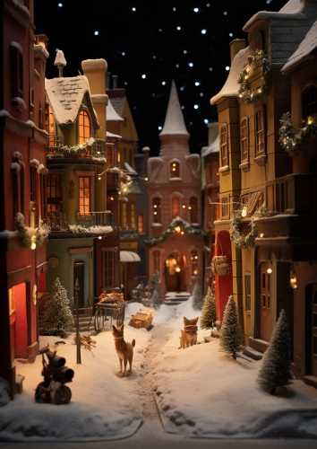 a cirque du soleil inspired small town street christmas scene with stop-motion german shepherds, creative lighting, stage lighting, wes anderson, coraline, animation, stop-motion, minitures, hand modeled --ar 5:7