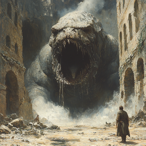 painting, Several hundred feet to his left, the ground opened and a massive creature emerged with the grace of a fish leaping from water. It resembled a snake composed of rough-hewn rock with a body at least a hundred feet in diameter. The golem traveled upward, turned back down toward the ground with gaping maw open wide, and reentered the hard, dry earth with such ease that Zylar almost expected a splash. Judging by the segments of rock serpent visible at one time, the creature had to be a thousand feet long from head to tail, ar— 9:16 --s 750 --q 2