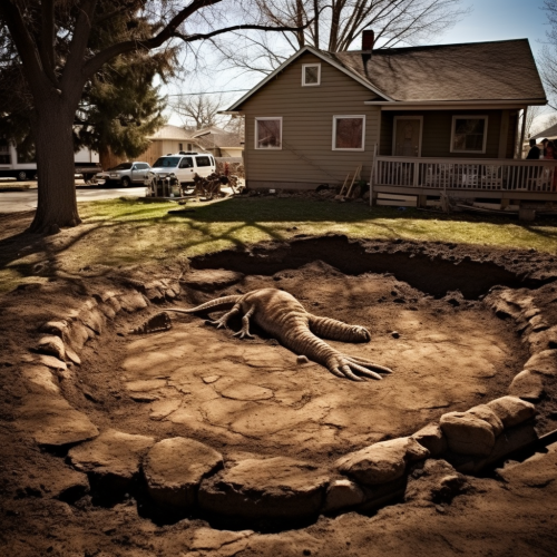 Dinosaur sculpture in dense forest with ancient artistry.