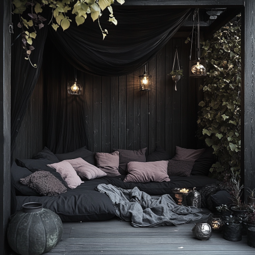 Moody boho deck , colors in black and gray, veil, wood,black metal,romantic, smoky pink and gray cushion,sitting place , garland of ligth, lot of plants, patios