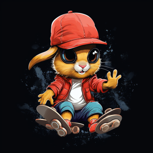 baby rabbit with cap and headphones riding skateboard, vector, screen printing, sticker, bright colors, high detail
