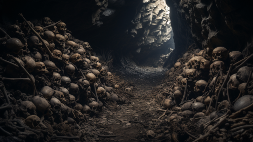 a dirty cavern at the top of a gorge in the Pyrenees that is home to a disgusting giant; the floor is filled with piles of bones and human remains, in the style of dark fantasy, photographic quality, hyper realistic picture, --ar 16:9