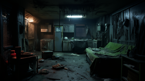 disgusting decrepid apartment in chicago full or trash and grime. Night time. Creey mood. --ar 16:9