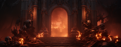 hell entrance, French national anthem and skeletons on the floor, giant guillotine, 3d, The demon of greed, 3D art, 32k uhd, Unreal Engine, high quality, horizons --ar 119:47