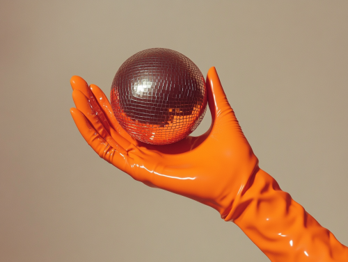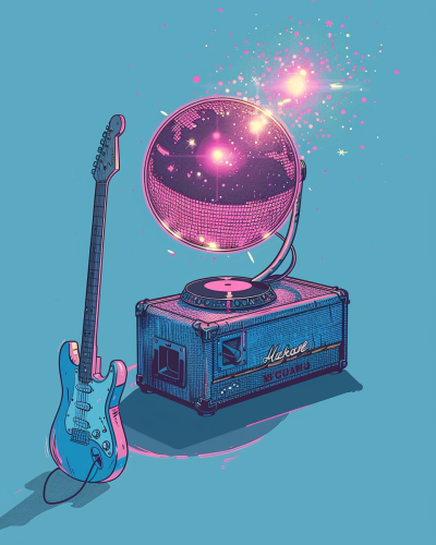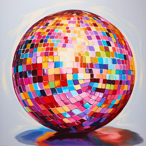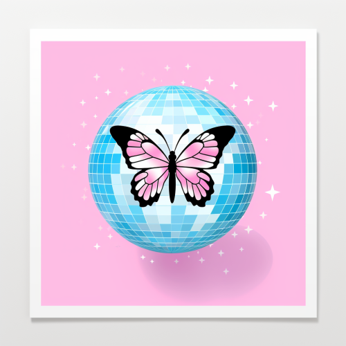 create a minimalistic cute and fun print design with a disco ball in the middle and a pink butterfly on the side of the disco ball. put the disco ball in the center of the print and use a light pastel blue background.