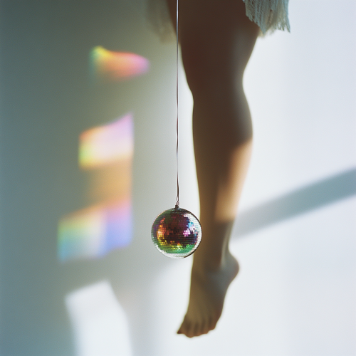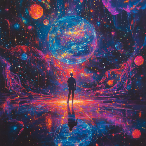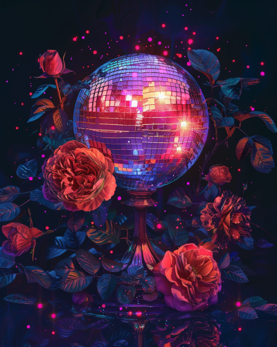 An ethereal figure in deep meditation, surrounded by swirling galaxies and cosmic elements; a bright light emanates from within against a star-filled night sky. Neon lights and shadows intertwine as the figure dances under a giant disco ball reflecting the cosmos. A neon-lit dance floor extends into the universe, where stars are caught like sparkling fragments. The scene combines introspection with vibrant cosmic romance. Style: surrealism, vibrant colors, neon cyberpunk aesthetic, highly detailed, cinematic lighting, 8K resolution.