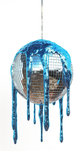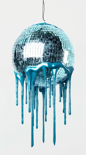 disco ball, hanging from the ceiling, shiny blue slime chrome dripping over the right side of the disco ball, solid white background, sharp details, photo realistic, sony a7 III camera, --v 6.0 --ar 9:16