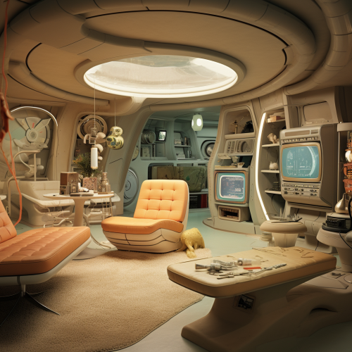 a storage room filled with too much technology, retro (1950s) aesthetics with futuristic technology, discovery of space suits, weapons, and other items, in a storage room, dusty, dirty, rusty