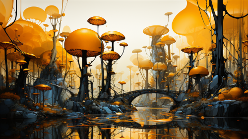 fractal art synthography deep forest, steampunk, Trees and bushes sketch, alcohol ink, thin black outline, yellow colors, blueprint, 3D --ar 16:9 --s 750