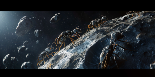 an IMAX movie still, extreme long shot of a small asteroid surface in deep space, six intricately detailed robot ants are crawling the asterid's surface, the robotic ants are dirty and broken with missing legs, harsh side light, strong contrast, washed colours, deep space --ar 2:1 --seed 28375534 --v 6.0 --s 50