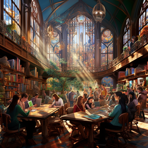 a large library of disneyland architecture style, a group of people study in a colorful library, colorful desk and chair ,maximalism, daylight, photorealistic --v 5.2