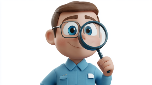 a cute avatar of an aircraft maintenance inspector. we see his face partially through the magnifying glass that he is holding up. solid white background. style of pixar 3d. --ar 16:9 --v 6.1