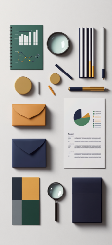 Generate a photorealistic version of Photorealistic minimalistic background with a light gray color, featuring small elements such as a magnifying glass, a bar graph, a pie chart, a resume document, and a briefcase, all placed at the edges in a flat lay arrangement. Use contrasting colors like navy blue, emerald green, and golden yellow for the elements to ensure they stand out against the light gray background. No text should be present on the background. . --ar 443:960