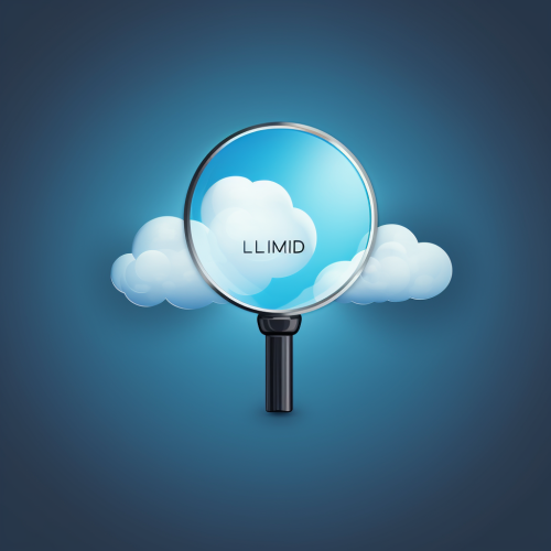A logo for a SaaS company called "Limpid". Display a magnifying glass that reveals the contents of a cloud