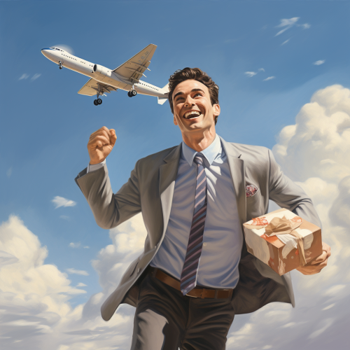 a realistic image of a business owner holding a package with an airplane flying low overhead