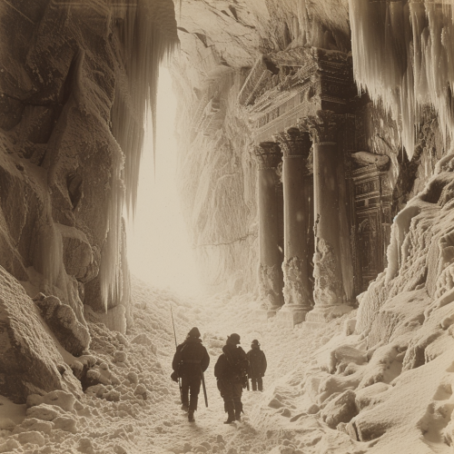 A photograph from the early 1900s of german antartic explorers of the Ahnenerbe about to enter an ancient temple built by a forgotten civilization deep within the antarctic ice --v 6.0 --s 250