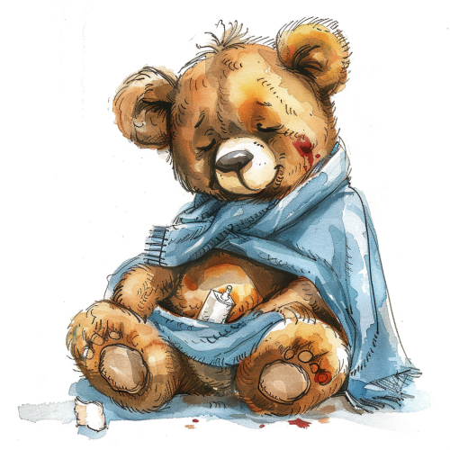 a bear not feeling well in the style of both Inge Look and Monica Estil, white background