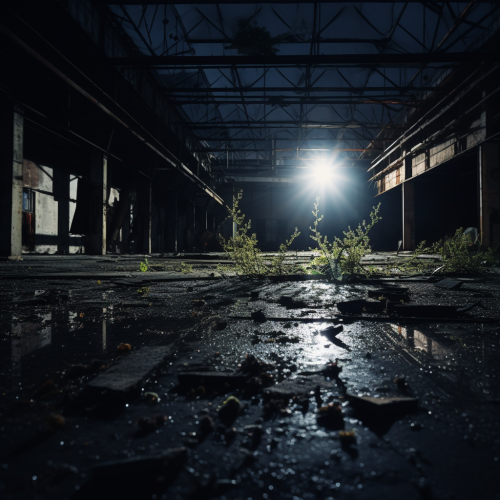 abandoned industrial building at night, cracked walls and concrete floor. Ruined. Plants are growing through the cracks everywhere. The roof is gone. The moon is the only light. moody but clean, 24mm, f2.0 with focus on a small puddle on the ground