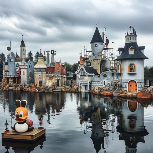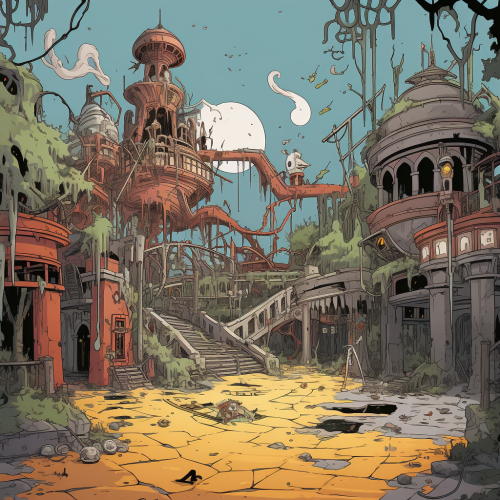 Abandoned amusement park overtaken by nature, rusted and broken rides covered in vines, moss growing on the cracked pavement, an old Ferris wheel looming in the background, eerie silence, mist rising through the overgrown trees, post-apocalyptic and haunting, cinematic, high-resolution, 8K, UHD --s 750 --style raw --v 6.0 --ar 16:9