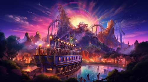 print ready art for a magazine ad featuring a colorful theme park ride, highly detailed, Sony mirrorless camera, 22 megapixels, DSLR, 50mm lens f/2.8, at night, --ar 16:9