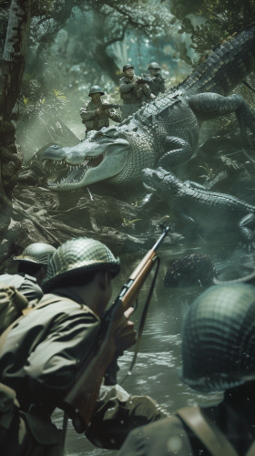 a hyper realistic image of japanese soldiers defending ramree island in world war 2. the image has little color to it. there are alligators in the background. --ar 9:16 --v 6.0