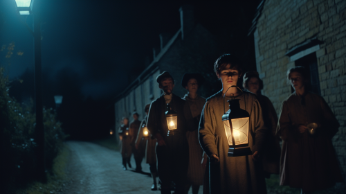 Film still, style by 1980s fantasy film. people with a lantern walking at night. Sharp and detailed, film grain, Kodak 200T, no dramatic lighting, fairy tale, global illumination, uplight, 16-35mm lens, f1.8 --ar 16:9 --v 5.0