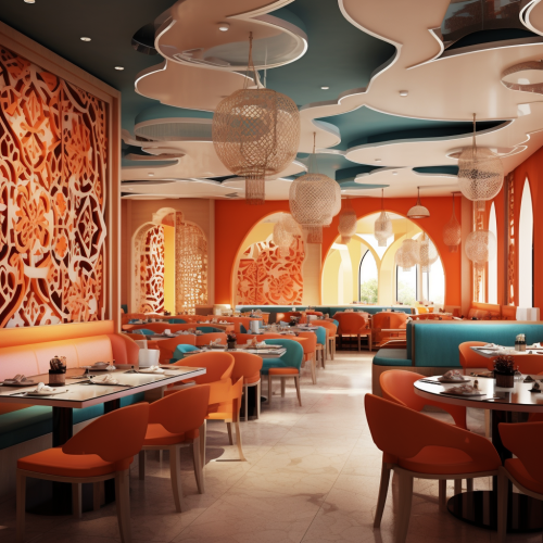 resturant interior design with arabic theme and trendy colors the resturant name is تغميسة